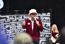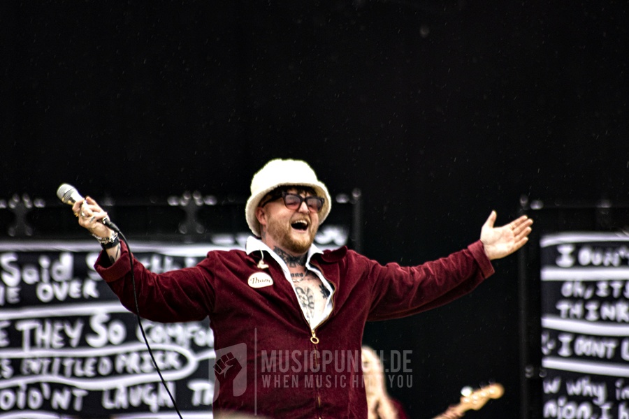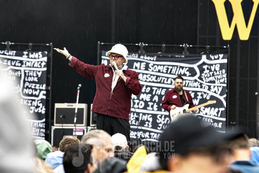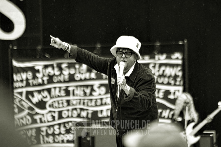 Wie nicht anders zu erwarten war, wurde geklotzt und „Let Me Entertain You“ wurde erfüllt. Gleich zu Beginn ließ er sich im Raumanzug (gut gesichert natürlich) über die Bühne schweben. Erfreulicherweise waren die Fans so mit singen und jubeln beschäftigt, dass die Regenschauer einfach weggetanzt wurden.