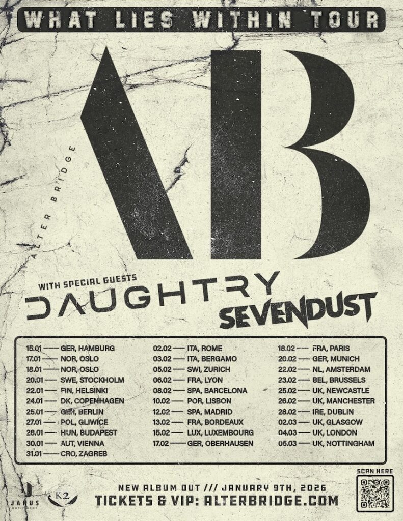 Auch nach mehr als zwanzig gemeinsamen Jahren zeigen die Rocker Alter Bridge keine Anzeichen von Müdigkeit. Von Kritiken und Fans für einprägsame Riffs und einander duellierende Gitarren-Attacken sowie ansteckende Gesangsmelodien gefeiert, will das Quartett bestehend aus Frontmann Myles Kennedy, Gitarrist Mark Tremonti, Bassist Brian Marshall und Schlagzeuger Scott Phillips den Trend mit ihrem achten Album, veröffentlicht über Napalm Records, fortsetzen. „Alter Bridge“ erscheint am 9. Januar 2026; erste physische Formate können schon jetzt vorbestellt werden.