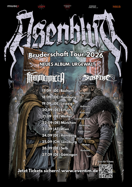 Die deutschen Viking-Metal-Berserker Asenblut gehen im September auf Album-Release-Tour. Unter dem Banner „Bruderschaft“ bringen sie ihr neues Album „Urgewalt“ auf die Bühne und versprechen 11 kompromisslose Shows in Deutschland, Österreich und der Schweiz. Unterstützt werden die Recken von Flammenmeer und der griechischen Metal-Sensation Subfire.