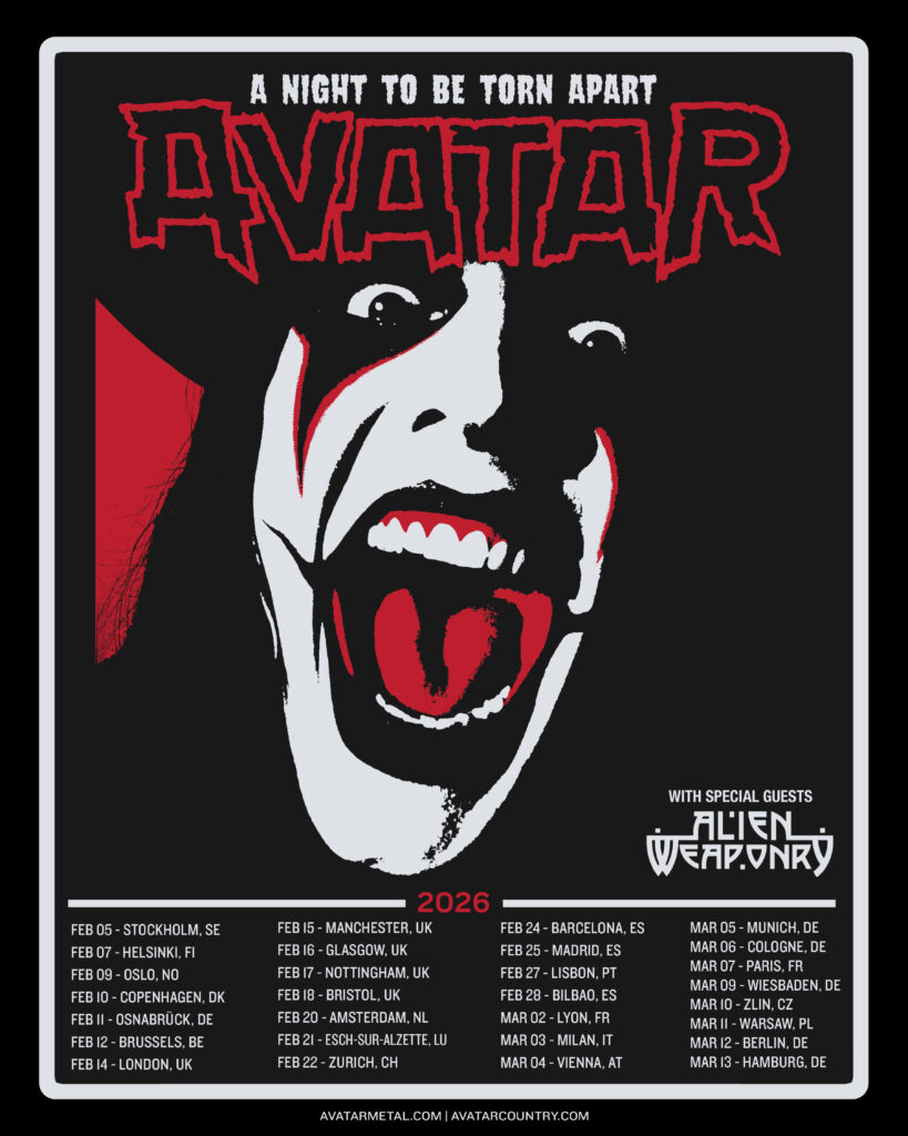 Damit geben sie einen ersten Vorgeschmack auf eine atemberaubende neue Live-Produktion ihrer bevorstehenden Welttournee, bei der Johannes Eckerström seine musische Truppe bestehend aus John Alfredsson, Jonas Jarlsby, Henrik Sandelin und Tim Öhrström um den Globus führen wird. Mit alten und neuen Songs aus der gesamten Band-Historie werden Avatar so auftreten, wie man sie noch nie zuvor gesehen hat. Sie spielen einige der größten Shows ihrer 25-jährigen Karriere – darunter eine bahnbrechende Show in der Valentinsnacht im Londoner Exhibition – einem Veranstaltungsort in einem denkmalgeschützten Gebäude in White City.
