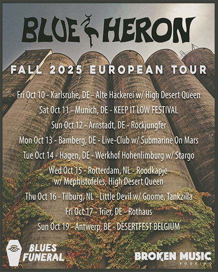 Im Hochgefühl des Erfolgs ihres zweiten Albums „Everything Fades“ aus 2024 hat Blue Heron eine Reihe von Europatour-Daten für diesen Oktober angekündigt, einschließlich Auftritten bei zwei wichtigen Festivals der Szene. Mit neun Konzerten neben Bands wie Gnome, Mephistofeles und High Desert Queen wird die Band ihre mitreißende Desert-Rock-Musik erstmals auf Bühnen in Deutschland, den Niederlanden und Belgien bringen.