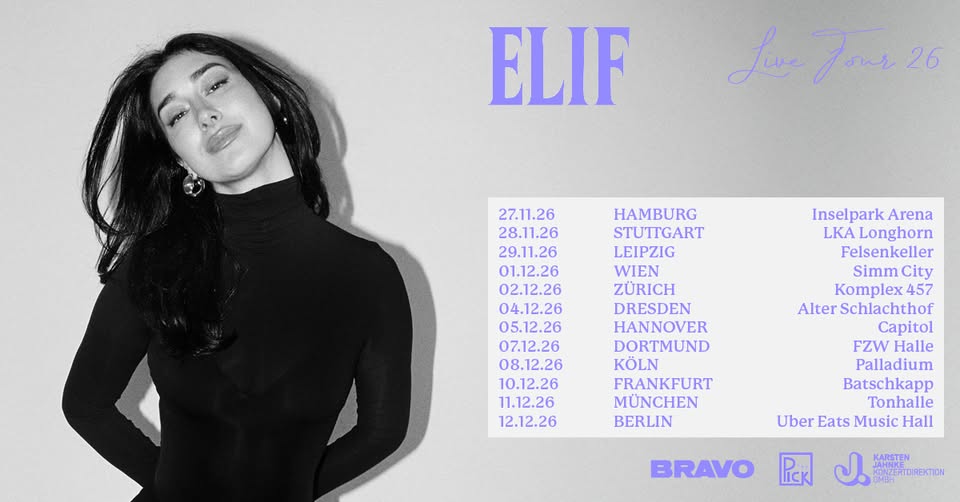 Gerade hat Elif ihre Single “Nein” veröffentlicht, ein starkes Statement über den Mut, ‘Nein’ zu sagen. Im November erscheint mit “AZRA” eine weitere neue Single und eine EP – ein neues Album erscheint im kommenden Jahr! Live verspricht Elif eine intensive, atmosphärische Show – voller Emotionen, Energie und Nähe – ein unvergessliches Konzerterlebnis.