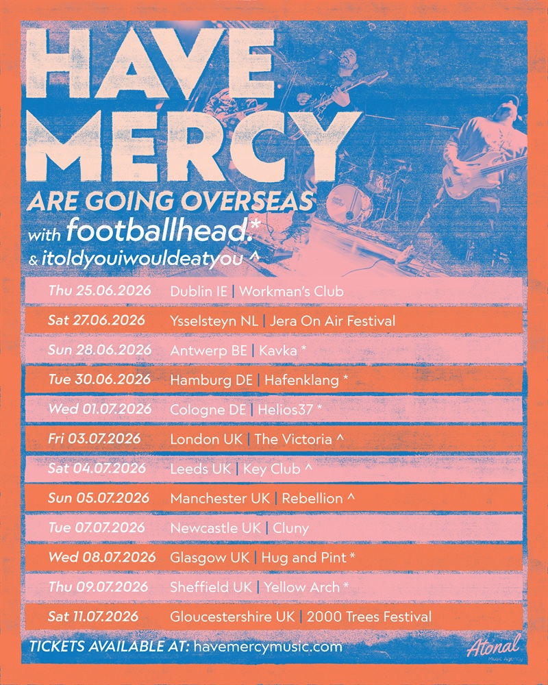 Die amerikanische Alternative-Rock-Band Have Mercy wird erstmals seit über zehn Jahren nach Europa zurückkehren und eine Reihe von Headline-Shows sowie Festivalauftritten im Vereinigten Königreich und auf dem europäischen Festland in diesem Sommer ankündigen. Auf ausgewählten Terminen werden die Band von den Special Guests Footballhead und itoldyouiwouldeatyou begleitet.