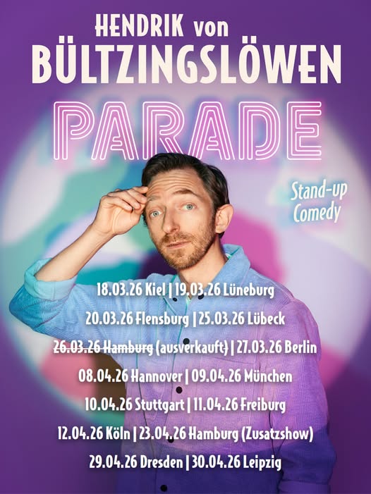 Der Hamburger Hendrik von Bültzingslöwen ist seit vielen Jahren eine feste Größe der Comedy-Szene. 2023 und 2024 war er Sieger des Hamburger Stand-up Slams. Als Schauspieler kennt man ihn aus etwa 100 Kino- und Fernsehproduktionen, darunter Wes Andersons „Grand Budapest Hotel“ und in der deutschen Comedyserie „Jerks“. Seine Instagram-Reels wurden millionenfach angesehen, allen voran seine Rolle als Hipster und FC St. Pauli-Fan G. Alao. „Parade“ ist sein erstes Stand-Up-Soloprogramm!