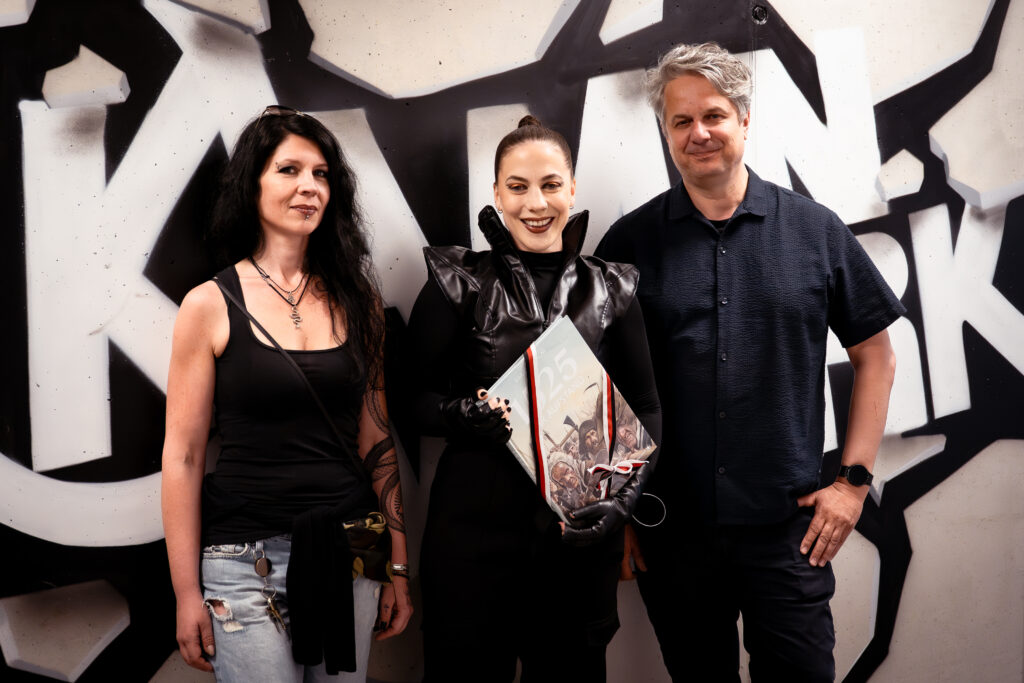 Eva Castro (links) und Matthias Ressler (rechts) überreichten LaFee als Dank und Anerkennung der Stadt ein mit einer Widmung von Memmingens Oberbürgermeister Jan Rothenbacher versehenes Exemplar der Graphic Novell „1525 – Der Aufstand“ von Giulio Camagni.