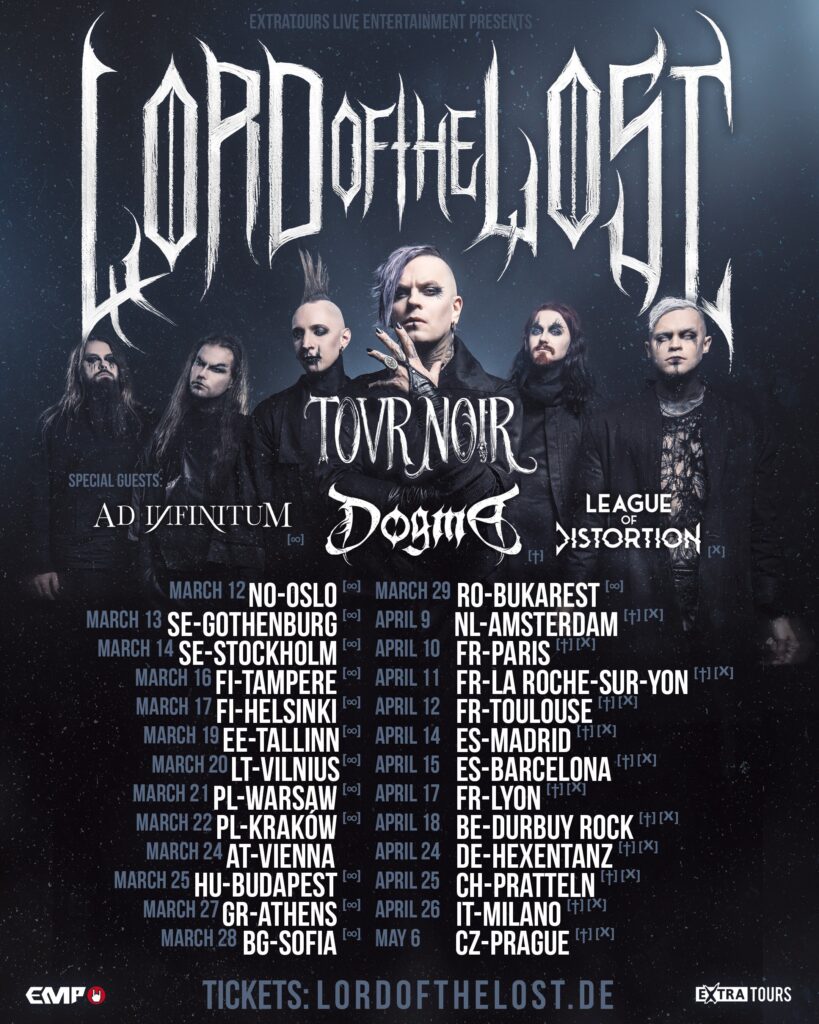 Das Sextett aus Hamburg bringt seinen charakteristisch dunklen Sound 2026 erneut auf die Bühnen Europas. Kurz nach ihrer Tour durch die USA, Kanada und Australien gehen Lord Of The Lost gemeinsam mit Ad Infinitum, League Of Distortion und Dogma auf große „TOVR NOIR“ durch insgesamt 19 europäische Länder.