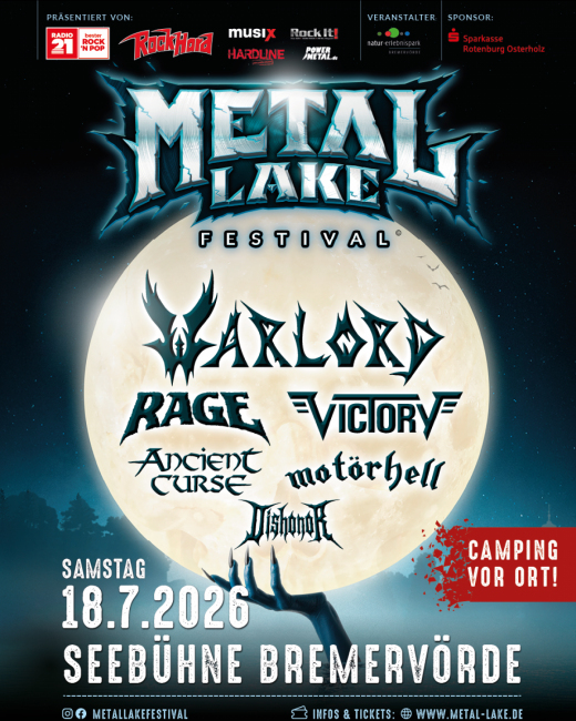 Am 18. Juli 2026 feiert das METAL LAKE FESTIVAL in Bremervörde Premiere! Die „Seebühne“ am Vörder See hat gerufen und von lokalen Newcomern bis zu internationalen Szene-Größen sind sechs Bands ihrem Ruf gefolgt. Als Headliner agiert der amerikanischen Epic Metal Act WARLORD, zuvor heizen die beiden legendären deutschen Größen RAGE und VICTORY ein. Eröffnen werden die lokalen DISHONOR, die italienische Motörhead-Tribute Band MOTÖRHELL sowie die über die Landesgrenzen hinaus bekannten Lokalmatadoren von ANCIENT CURSE, die seit 30 Jahren für feinsten Progressive Metal stehen.