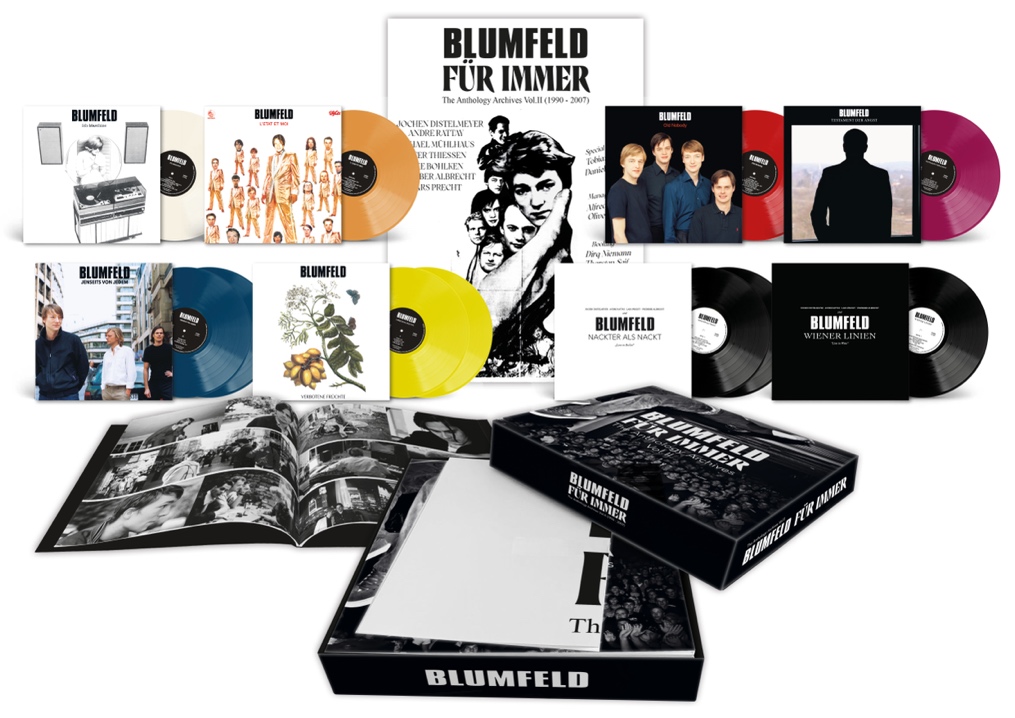 Um diesen bedeutenden Schritt gebührend zu feiern, veröffentlicht Sony Music die hochwertige, streng limitierte Vinyl-Box „Für Immer – The Anthology Archives Vol. II“, die den kompletten sechs Alben umfassenden Blumfeld-Katalog in neu gestalteter Form vereint. Die Edition ist auf 1.990 Exemplare limitiert – angelehnt an das Gründungsjahr der Band. Jede LP erscheint auf farbigem Vinyl, dessen Farbgebung jeweils auf das jeweilige Original-Artwork abgestimmt wurde. Ergänzend umfasst die Box ein exklusives Fotobuch mit zahlreichen bisher unveröffentlichten Bildern sowie ein A2-Poster, das eigens für diese Edition kreiert wurde.