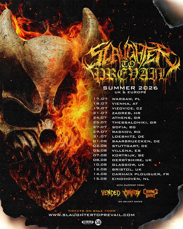 Die russische Metal-Macht Slaughter To Prevail hat gerade eine Reihe von europäischen Headliner-Terminen für den Sommer 2026 angekündigt und bringt ihre explosive Live-Show zusammen mit einer Reihe großer Festivalauftritte über den Kontinent. Begleitet werden Slaughter To Prevail an ausgewählten Terminen von den aufstrebenden Heavy-Acts Vended, Crypta und Chained Saint. Die Ankündigung folgt auf eine unermüdliche Tourphase der Band, die dank ihres vernichtenden Sounds und ihrer wilden Live-Auftritte schnell zu einer der beeindruckendsten Kräfte der modernen Heavy-Musik geworden ist.