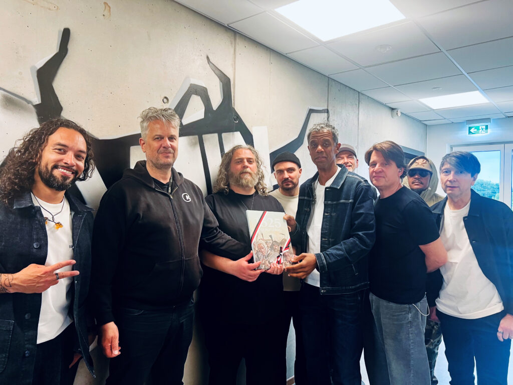 Als Zeichen des Dankes und der Anerkennung überreichte Matthias Ressler (zweiter von links) der Band im Namen der Stadt Memmingen ein besonderes Präsent: ein Exemplar der Graphic Novel „1525 – Der Aufstand“ von Giulio Camangi, versehen mit einer persönlichen Widmung von Oberbürgermeister Jan Rothenbacher.