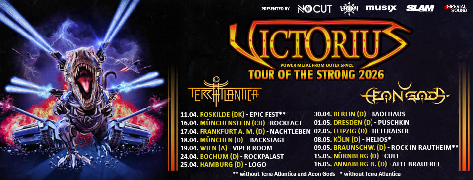 Mächtige Dinosaurierkrieger! Bitte begrüßt die Boten der großen alten Wesen als Teil der „Tour Of The Strong“ 2026! Die Aeon-Götter! Aus den Nebeln der Zeit erheben sich die Aeon-Götter, um die vergessenen Mythen der alten Götter in die Gegenwart zu tragen als Boten der antiken Mächte! Und jetzt werden sie an unserer Seite in die Schlacht reiten! Schärft eure Schwerter, holt euch eure Tickets und SCHLIESST EUCH UNSERER SCHLACHT AN!!!